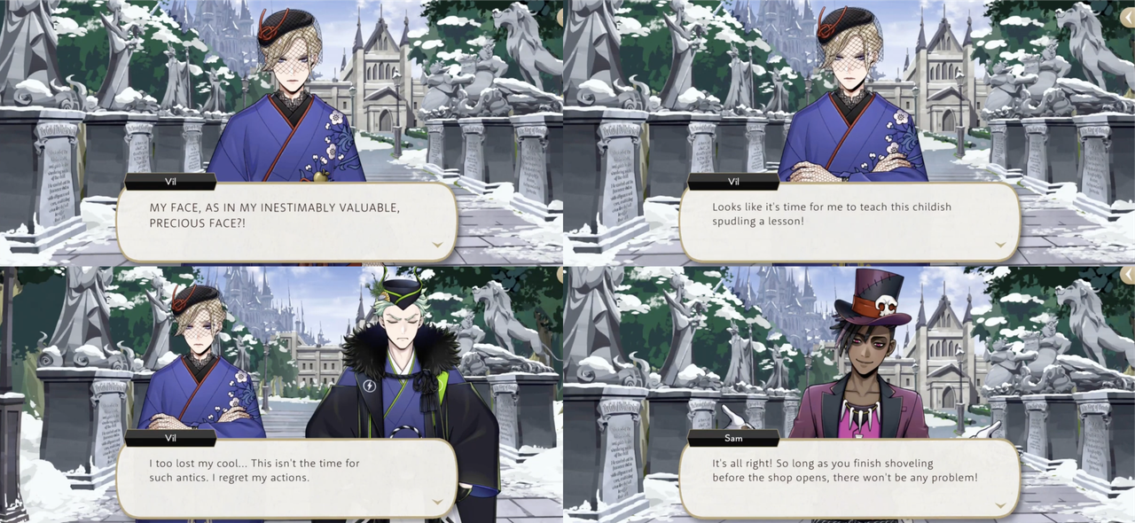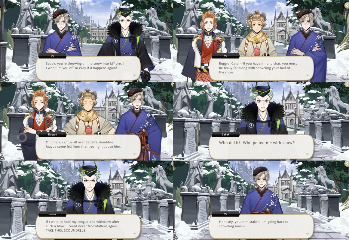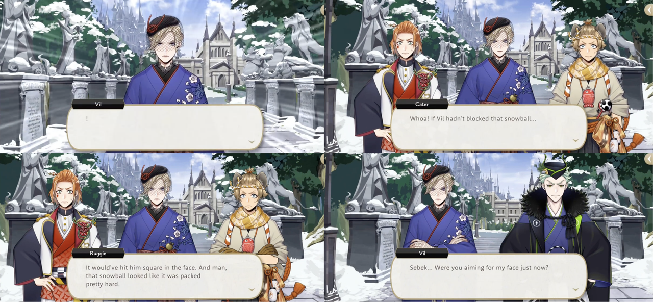 Sebek throws a snowball at Vil for revenge that he magically blocks, deciding to teach Sebek a lesson for aiming at his face. After Sam interrupts Vil admits that he “lost (his) cool,” saying that he regrets his actions.
