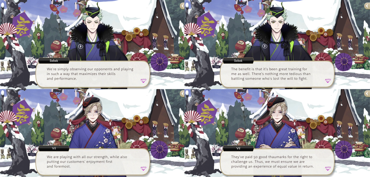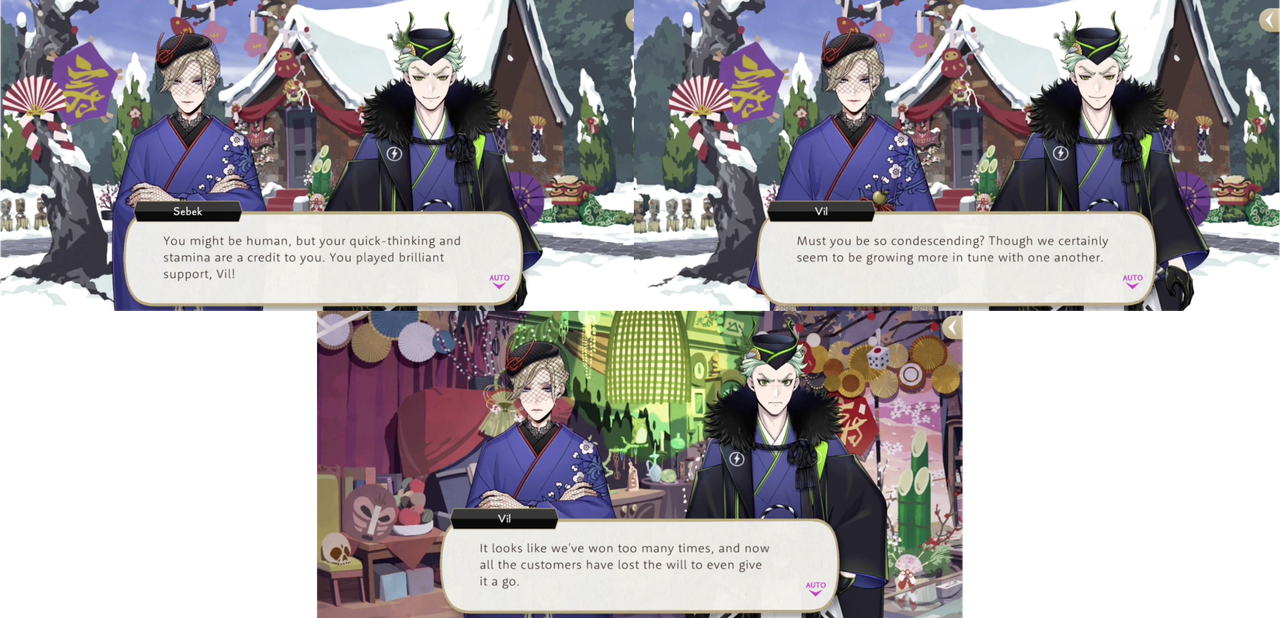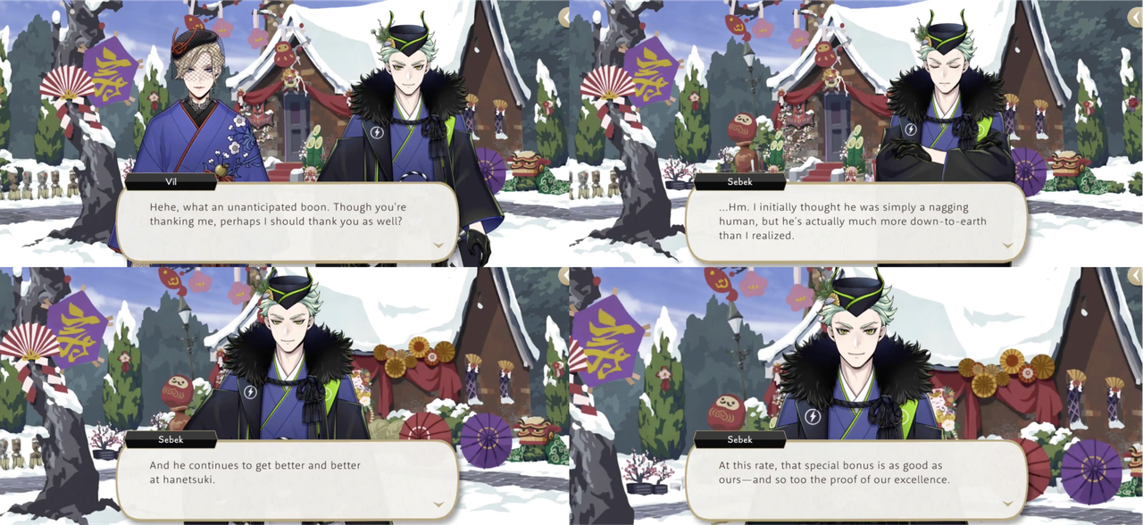 Vil says, “Let’s continue to support one another and preserve our energy-and hair-during the matches,” and Sebek offers to procure anything that Vil may want from Briar Valley in order to thank Vil properly. Vil requests plants that are native to the area for his personal care products, and Sebek agrees to send for them.