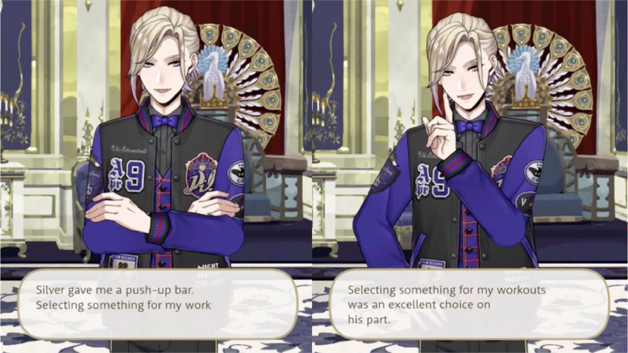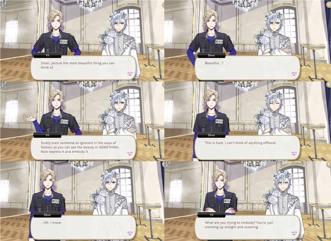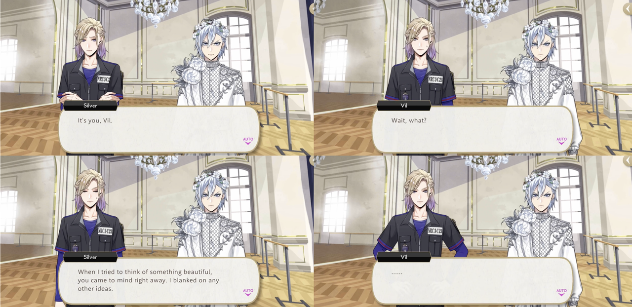 Silver struggles during the Fairy Gala IF event, with Vil instructing him to picture the most beautiful thing he can think of and embody it. When Silver begins to scowl Vil asks what he is doing and Silver explains, “It’s you. When I tried to think of something beautiful, you came to mind right away.”