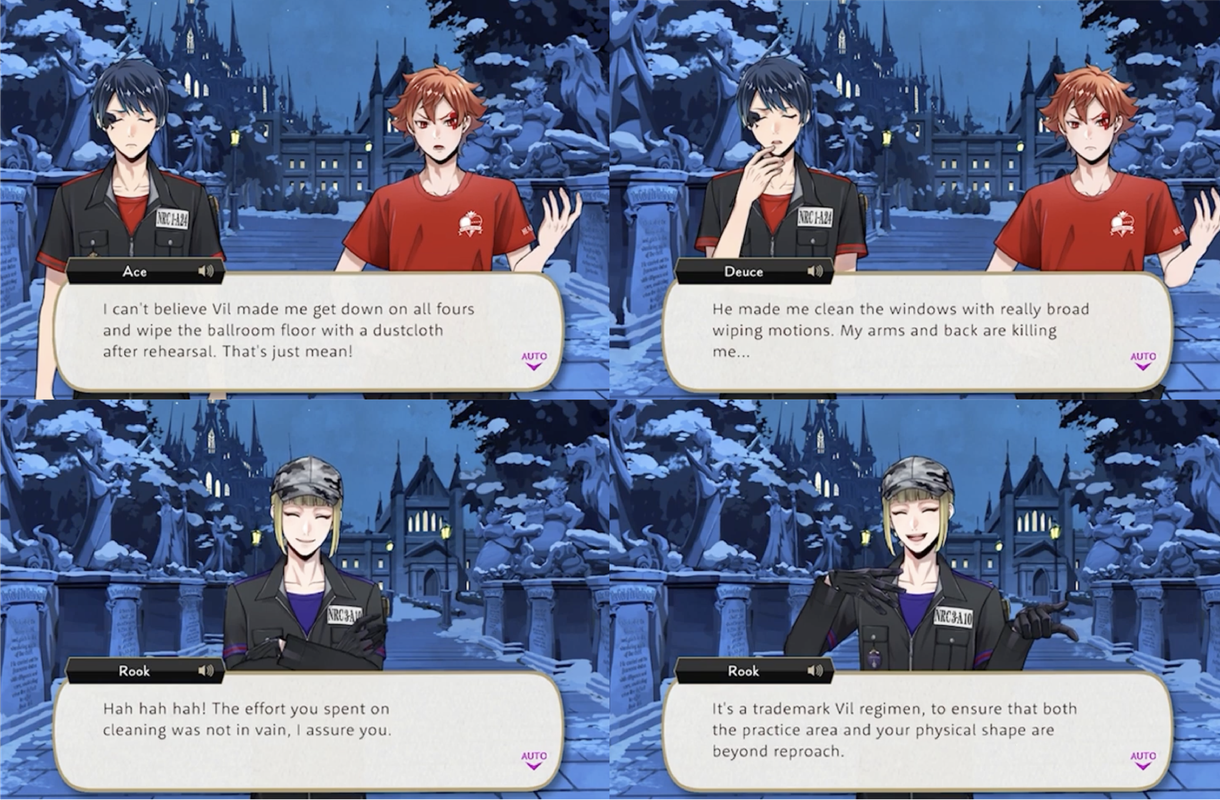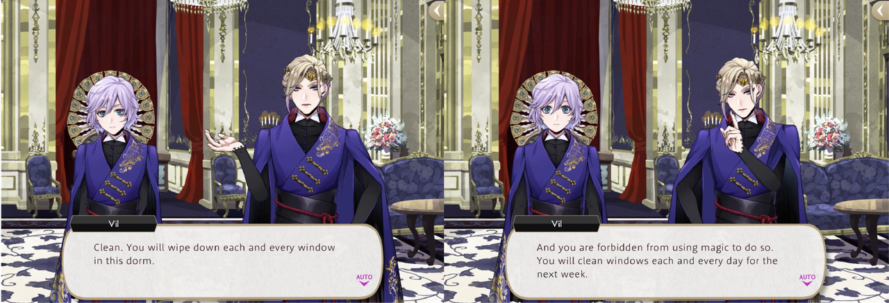 Vil assigns Book 5’s VDC team to post-rehearsal cleaning duties like wiping the floors and windows, and Rook explains it is “a trademark Vil regime”, and a cleaning regime is referenced again in Vil’s dorm vignette.