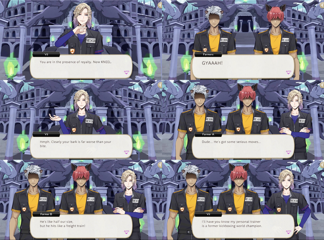 Vil proceeds to surprise the Savanaclaw students again later on, as well as Octavinelle students who had betrayed him, with a roundhouse kick that Silver again compliments.