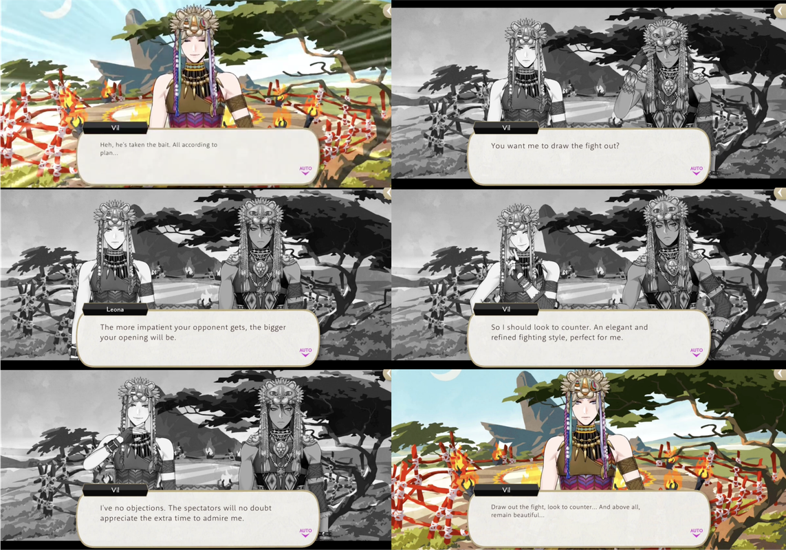 During the bout Vil reminds himself, “Draw out the fight, look to counter… And above all, remain beautiful…”
