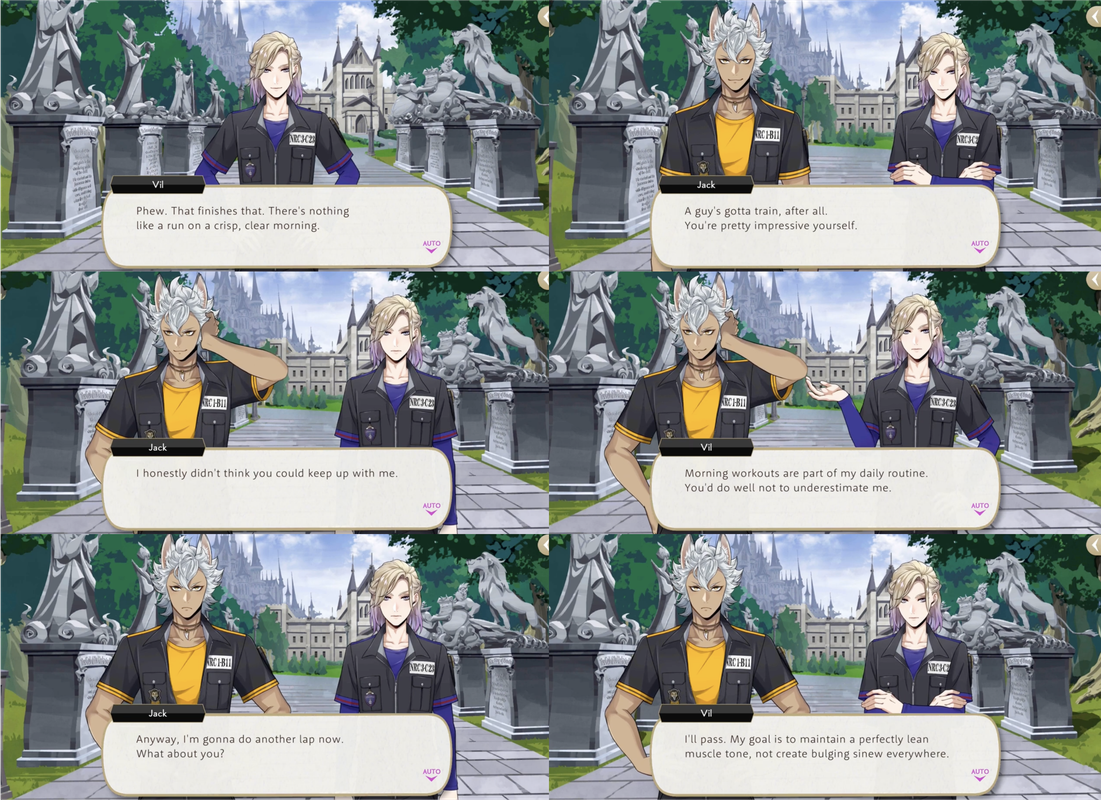 We see Vil go on a morning run with Jack who says he is surprised that Vil is able to keep up with him. Vil responds, “Morning workouts are part of my daily routine.You’d do well not to underestimate me,” but refuses to do an additional lap, saying, “My goal is to maintain a perfectly lean muscle tone, not create bulging sinew everywhere.”