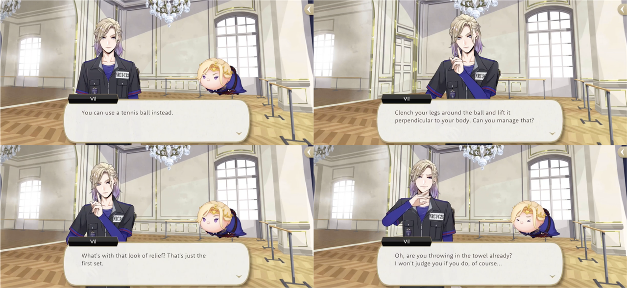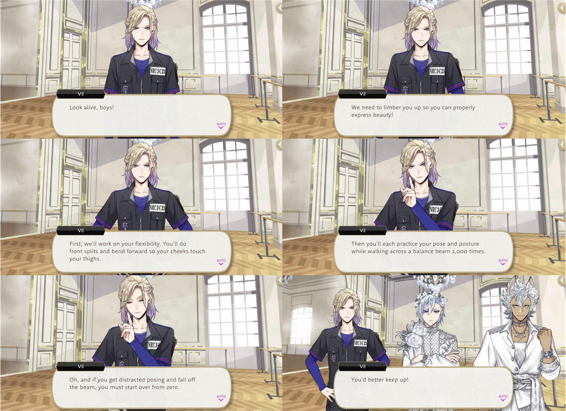 Vil is in charge of training the Fairy Gala IF team, having Jack and SIlver do splits, walk across a balance beam 2,000 times each, and do hour-long leg holds.