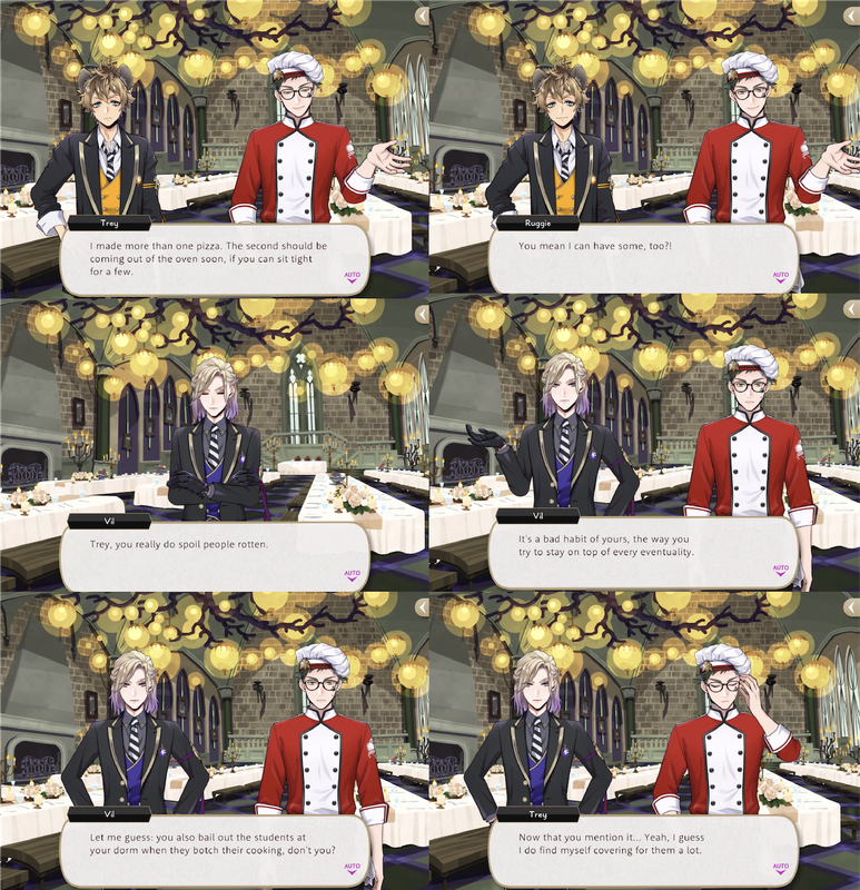 When Trey offers Ruggie a backup pizza to compensate for what Kalim had not been able to produce Vil again reflects that he spoils people rotten, saying that the way Trey stays on top of every eventuality is a bad habit.