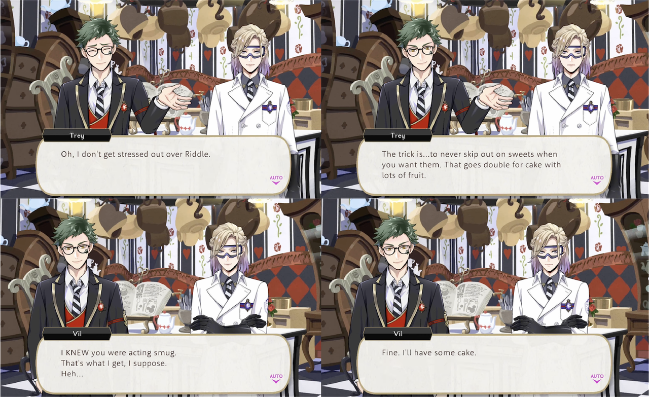 Trey insists that Riddle does not stress him out because he never skips out on sweets, and “that goes double for cake with lots of fruit”. Vil acquiesces and agrees to eat the offered slice of cake, saying, “Let me know if Riddle ever decides to have your head. My dorm would hire you on as our patissier in a heartbeat.”