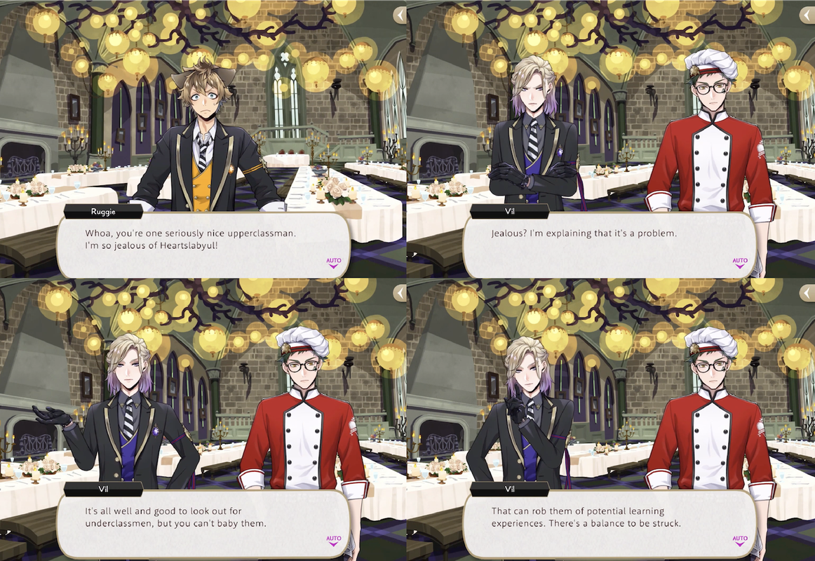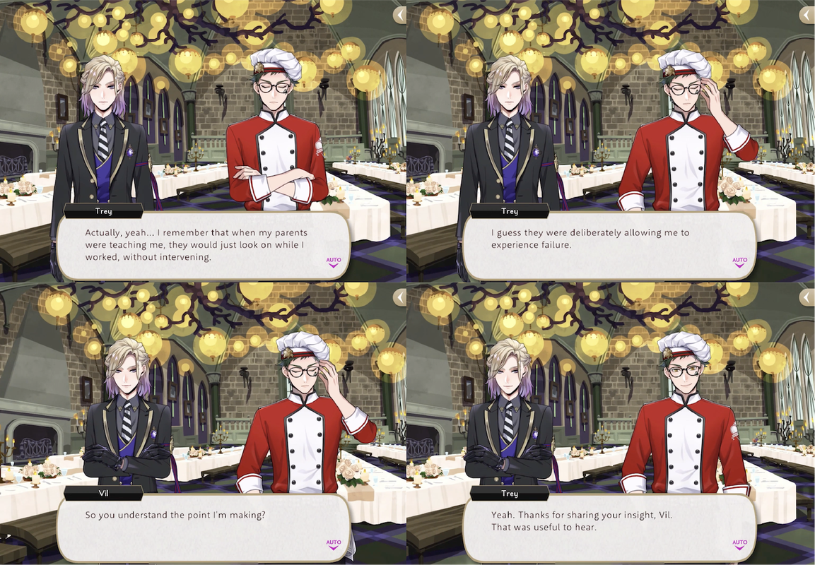 Vil calls Trey out on bailing out Heartslabyul students when they botch their cooking and explains it is a problem, as babying people “can rob them of potential learning experiences. There’s a balance to be struck.”