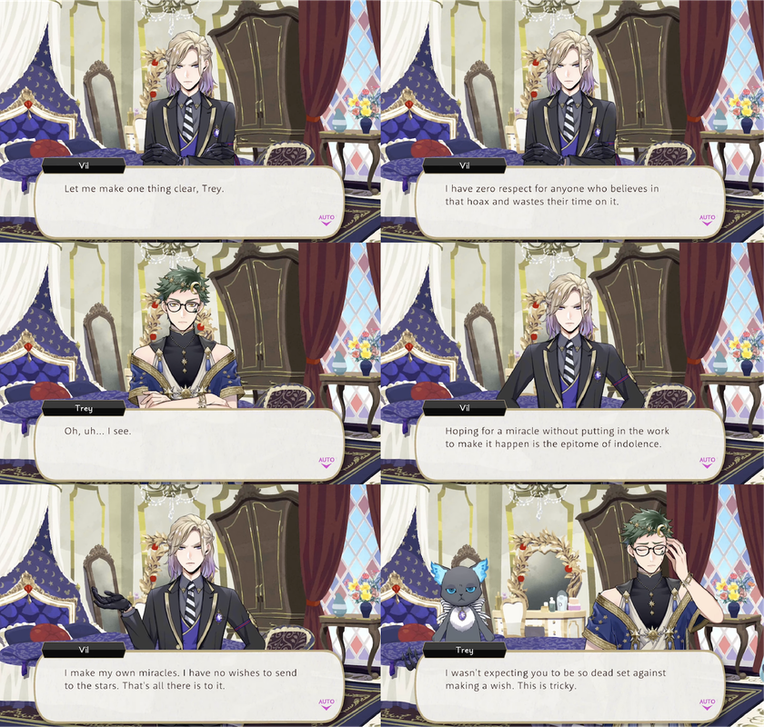 When Trey attempts to collect a wish from Vil for the event Vil refuses outright, as “hoping for a miracle without putting in the work to make it happen is the epitome of indolence. I make my own miracles.” He eventually makes the wish of “quit nagging me right now” to get Trey to leave him alone.