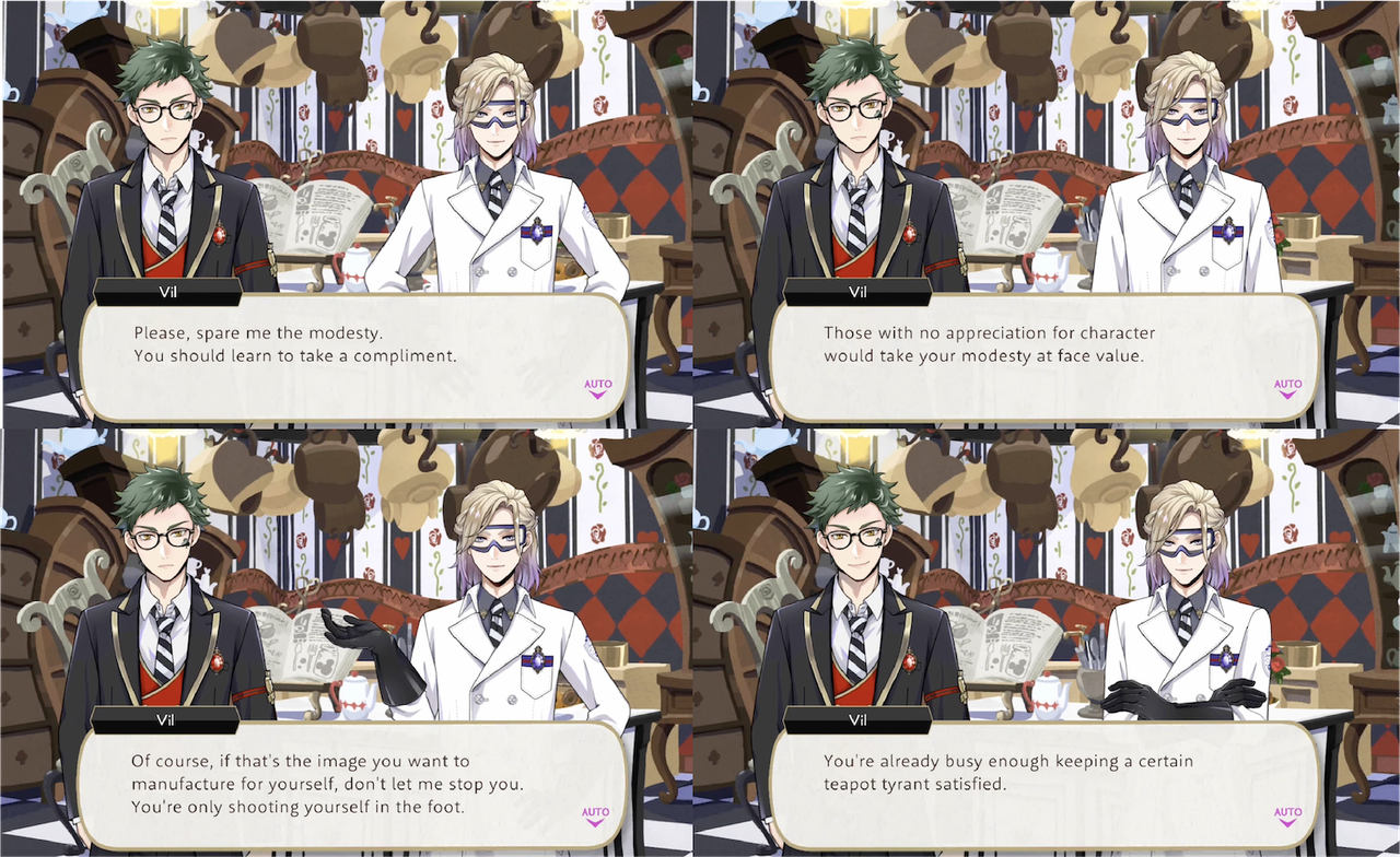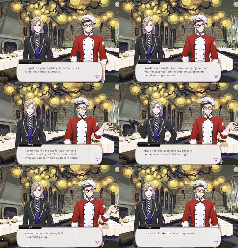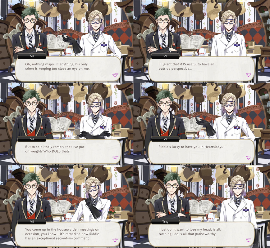 Trey invites Vil back to Heartsabyul to talk and Vil explains his situation and compliments Trey, which Trey tries to play down. Vil insists, “You should learn to take a compliment. Those with no appreciation for character would take your modesty at face value. Of course, if that’s the image you want to manufacture for yourself, don’t let me stop you. You’re only shooting yourself in the foot.”