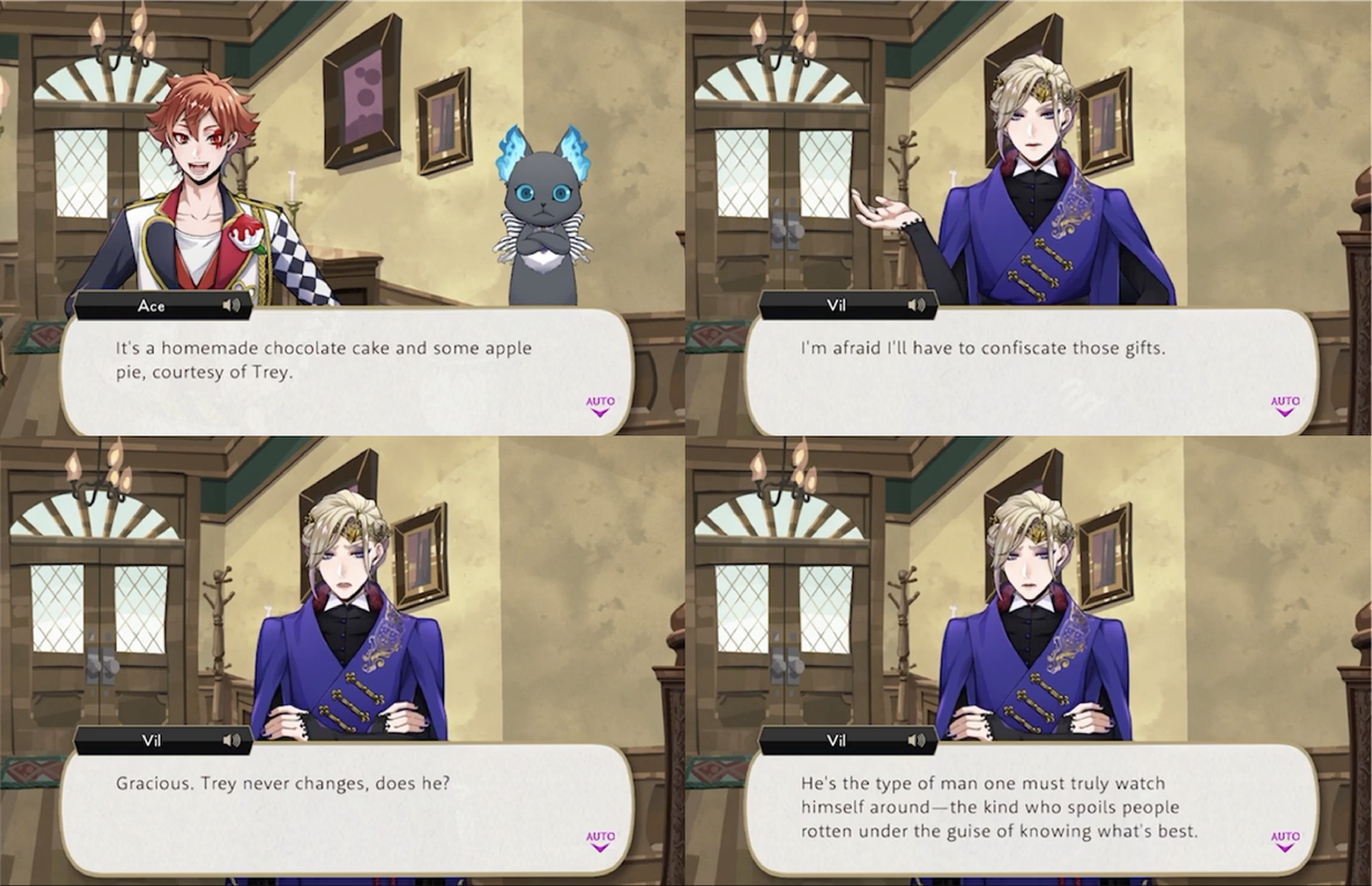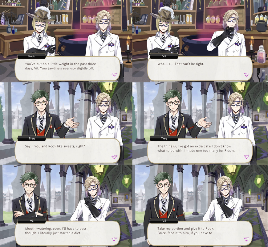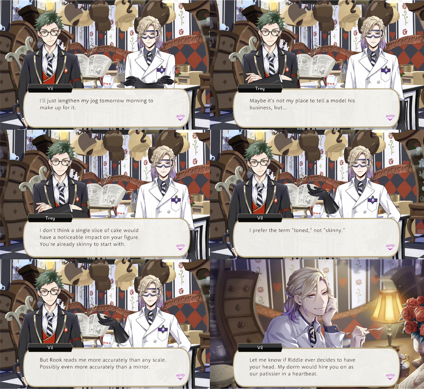 Vil runs into Trey directly after being told by Rook that he has been gaining weight, only for Trey to offer him a cake. Vil responds, “Take my portion and give it to Rook. Force-feed it to him, if you have to.”