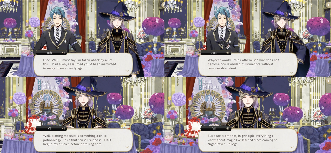 Jade comments on how surprising it is that Vil did not receive magical instruction from an early age as “One does not become housewarden of Pomefiore without considerable talent” and Vil explains, “crafting makeup is something akin to potionology. So in that sense I suppose I HAD begun my studies before enrolling here. But apart from that, in principle everything ! know about magic l’ve learned since coming to Night Raven College.”
